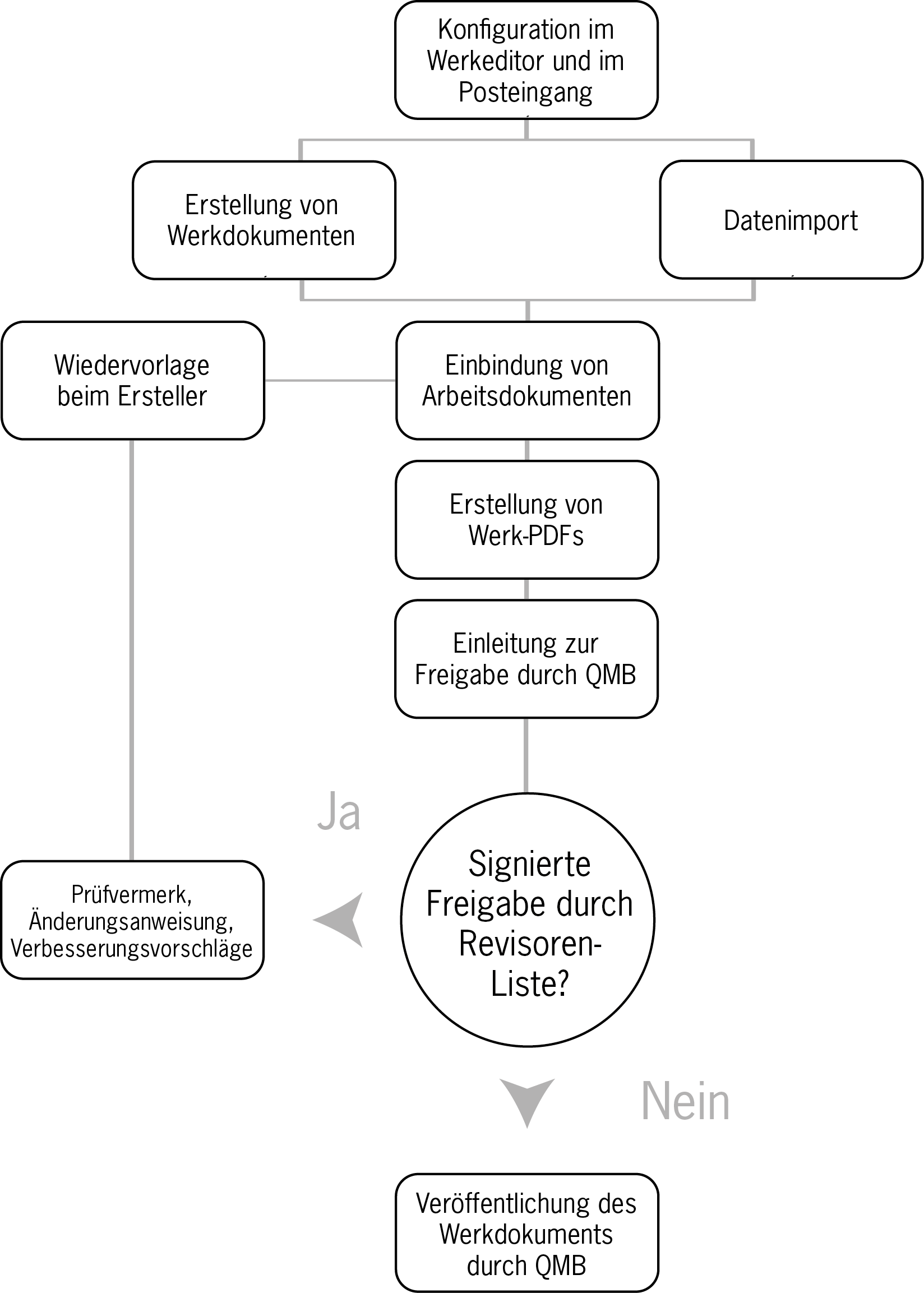 Dazu werden neue Dokumente erstellt und/oder bereits bestehende in das Programm diosDM importiert. Diese Dokumente werden durch den Qualitätsmanagementbeauftragten, im Folgenden QMB genannt, zur Freigabe eingeleitet und durch Revisoren freigegeben. Anschließend veröffentlicht der QMB die endgültige Fassung des Dokuments.