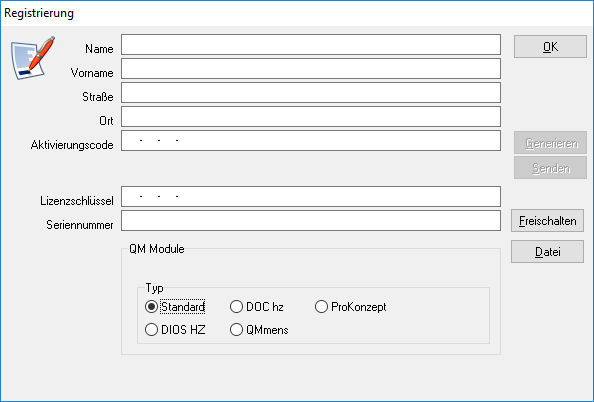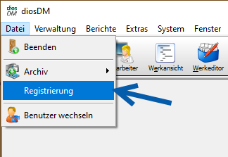 Öffnen Sie zur Eingabe Ihrer Registrierungsdaten das Fenster Registrierung über den Menüpunkt Datei und den Auswahlpunkt Registrierung.