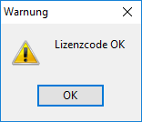 Unten dargestelltes Fenster informiert anschließend über den korrekten Lizenzcode. Verlassen Sie dieses und anschließend das Fenster Registirerung über einen Mausklick auf den Button OK.