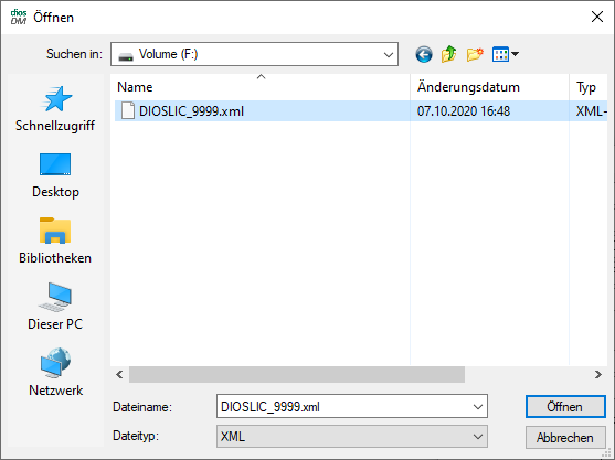 Wahlweise können die Lizenzdaten über einen Mausklick auf den Button Datei eingegeben werden, verwenden Sie in diesem Fall die von der dios zur Verfügung gestellte Lizenzdatei DIOSLIC_XXXX.xml.