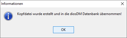 Abschließend wird informiert, dass die Kopfdatei erstellt wurde in die Datenbank übernommen wurde. So ist diese jederzeit wieder aufrufbar und ggf. änderbar.