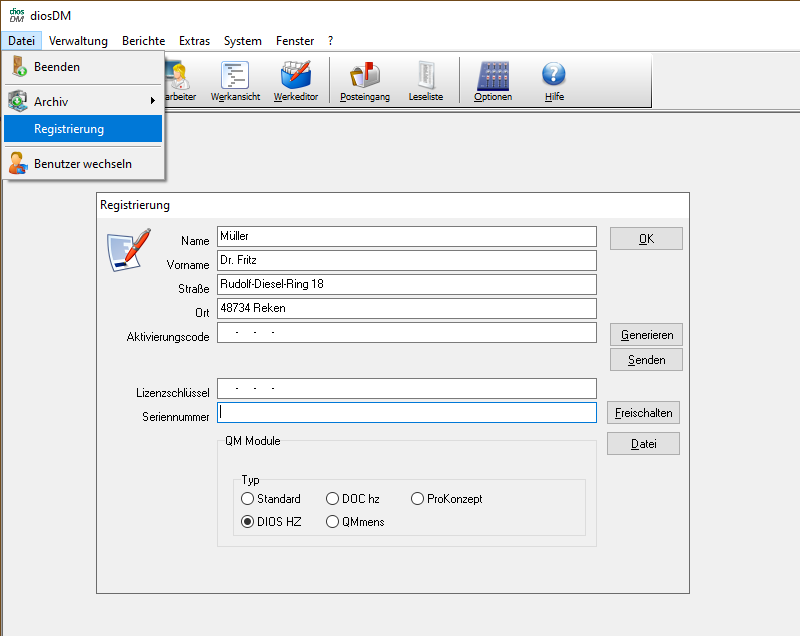 Praxisname und -anschrift wird aus den Angaben im Fenster Registrierung entnommen.