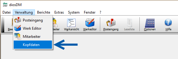 Das Fenster Kopfdaten wird über den Menüpunkt Verwaltung geöffnet.