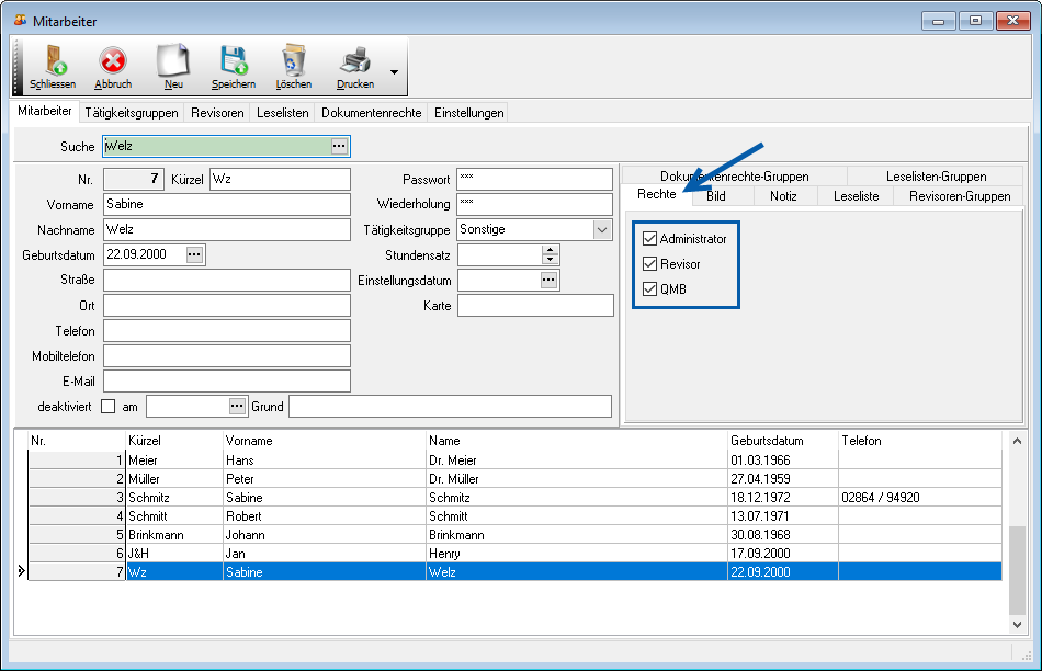 Administratoren können die eigenen Passwörter und die aller anderen Mitarbeiter ändern. Administratoren erhalten automatisch die weiteren zwei Rechte Revisor und QMB.