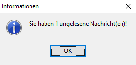 Bei aktivierter Benutzeranmeldung öffnet sich nach Angabe eines Benutzers mit seinem Kürzel und Passwort ein Fenster, dass darüber informiert, wie viele Nachrichten sich im Posteingang dieses Benutzers befinden.