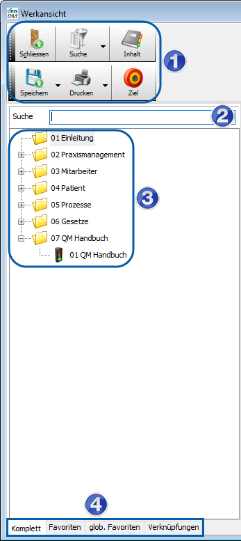 Die linke Fensterhälfte der Werkansicht bildet die Gliederung ab. Die Gliederung wurde im unten dargestellten Screenshot in unterschiedliche Bereiche eingeteilt: 1. Buttons, 2. Suche,