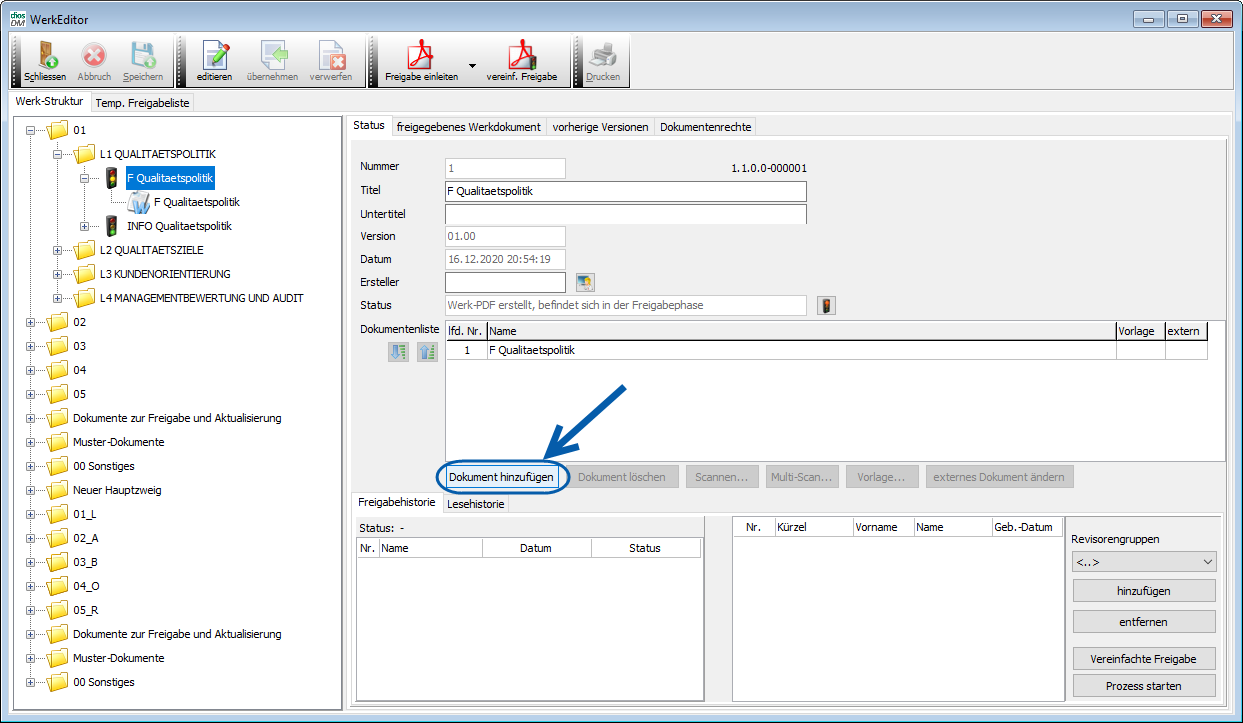 Die Anlage eines Werkdokuments über eine lokale Datei wird im Werkeditor über den Button Dokument hinzufügen realisiert.