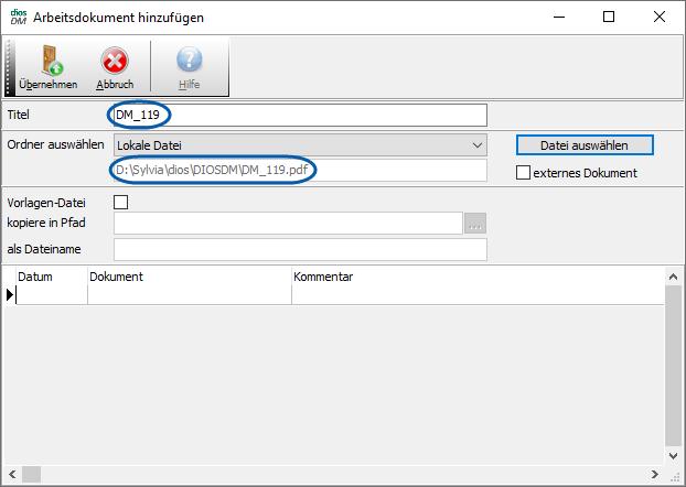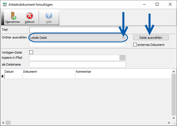 Wird in dem Fenster Arbeitsdokument hinzufügen eine lokale Datei ausgewählt, erscheint der Button Datei auswählen.