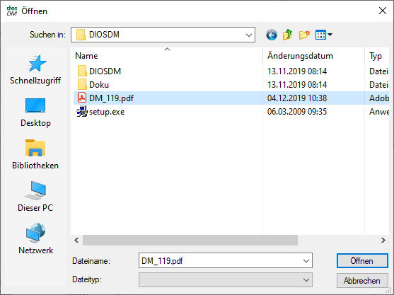 Nach einem Mausklick auf diesen Button erscheint das Fenster Datei öffnen. Wählen Sie hier die benötigte Datei aus und verlassen das Fenster über den Button Öffnen.