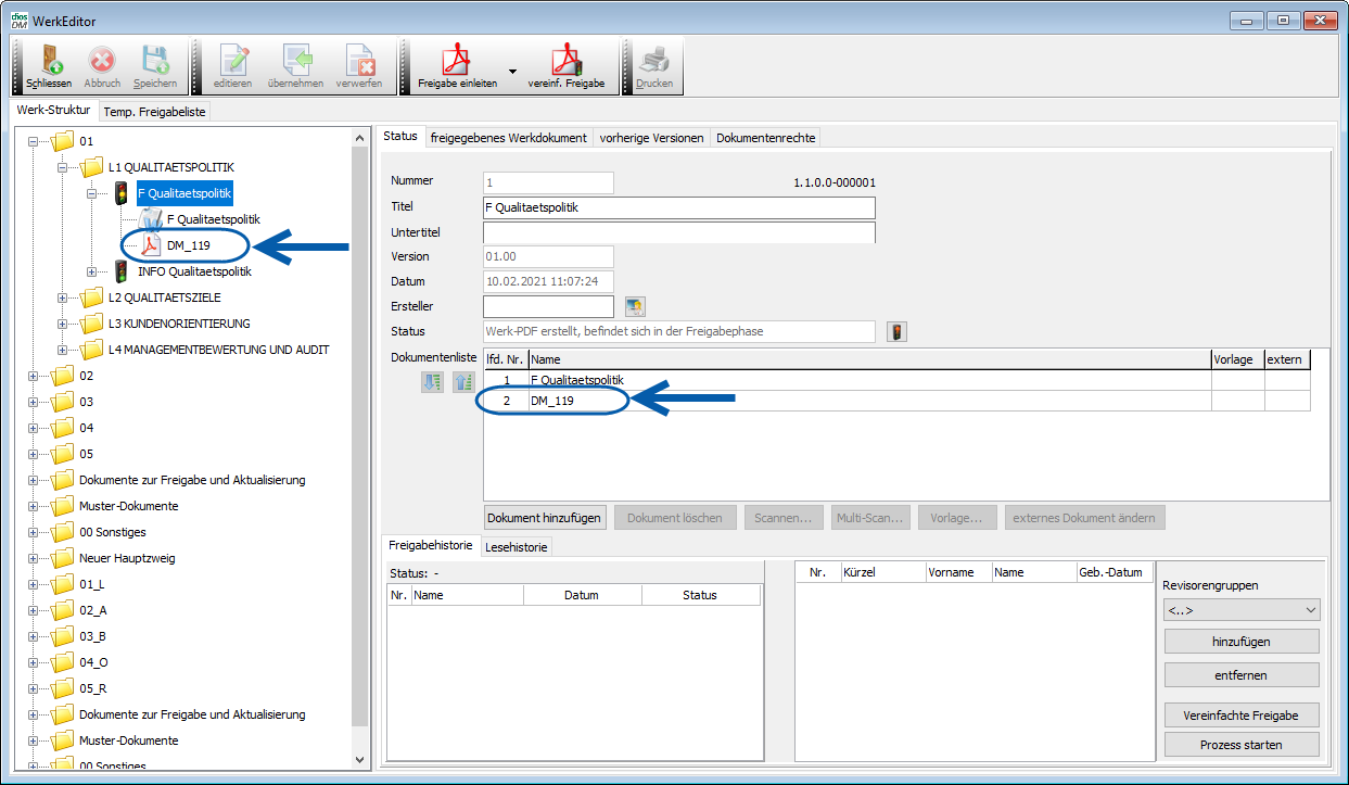 Das Arbeitsdokument wird jetzt in der Baumstruktur unter dem Werkdokument angezeigt, zusätzlich ist es in der rechten Fensterhälfte in dem Feld Dokumentenliste eingetragen. Lesen Sie bitte im Abschnitt Arbeitsdokument editieren nach, wie das Dokument verändert werden kann.
