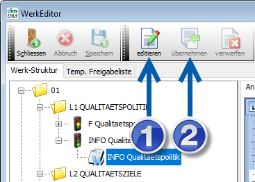 Markieren Sie dazu das Arbeitsdokument und klicken anschließend auf den Button editieren, der im obigen Screenshot mit einer 1 versehen ist. Direkt öffnet sich die entsprechende Anwendung. Hier kann das Arbeitsdokument beliebig verändert werden. Sind alle Änderungen durchgeführt, erscheint beim Schließen die Abfrage, ob die Änderungen gespeichert werden und anschließend in diosDM über den Button übernehmen, im obigen Screenshot mit einer 2 versehen, wieder in den Werkeditor eingepflegt werden sollen.