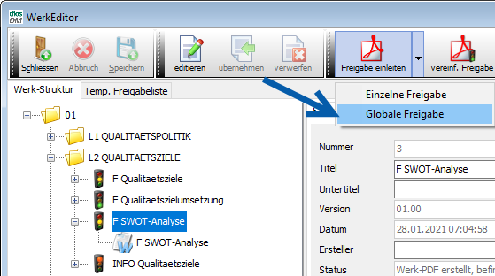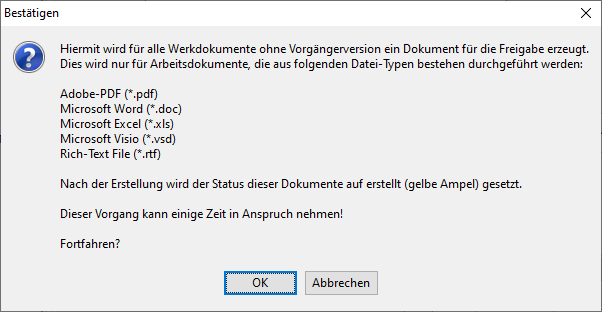 Die globale Freigabe aller Werkdokumente wird genutzt, um für alle Werkdokumente ohne Vorgängeversion neue PDF-Dokumente für die Freigabe zu erzeugen.