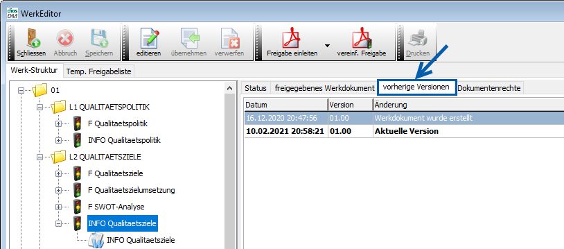 Im Werkeditor kann über das Register vorherige Versionen nach älteren Werkdokumenten gesucht werden. Fett dargestellte Zeilen bezeichnen neue bzw. überarbeitete Versionen. Mit einem Doppelklick werden diese Dokumente angezeigt. Somit ist es möglich, vorherige Versionen eines Dokuments mit der aktuellen Version zu vergleichen.