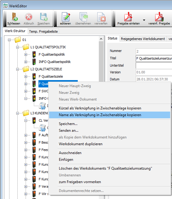 Öffnen Sie hierzu zunächst den Werkeditor und suchen Sie das zu verlinkende Dokument in der Werkstruktur. Klicken Sie dieses mit der rechten Maustaste an und wählen im Kontextmenü den Punkt Name als Verknüpfung in Zwischenablage kopieren.