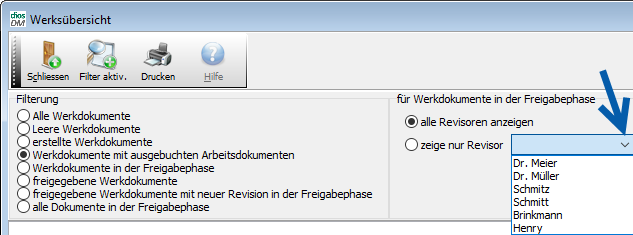 Klicken Sie nach der Auswahl bitte einmal auf den Button Filter aktiv, um die Ansicht anzupasen. Zusätzlich können die Dokumente revisorspezifisch sortiert werden. Aktivieren Sie dazu den Punkt zeige nur Revisor und wählen den entsprechenden Revisor aus der drop-down-liste aus. Bestätigen Sie Ihre Auswahl mit einem Mausklick auf den Button Filter aktiv.