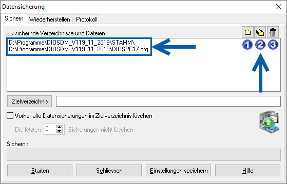 In dem Fenster Datensicherung, Register Sichern, sind bereits die erforderlichen Daten zum Programmbetrieb enthalten. Weitere Dateien werden über den mit 1 beschrifteten Button, weitere Dateiordner über den mit 2 beschrifteten Button der aktuellen Sicherung hinzugefügt. Zum Löschen von zu sichernden Verzeichnissen nutzen Sie bitte den Papierkorb-Button, der mit 3 versehen ist.