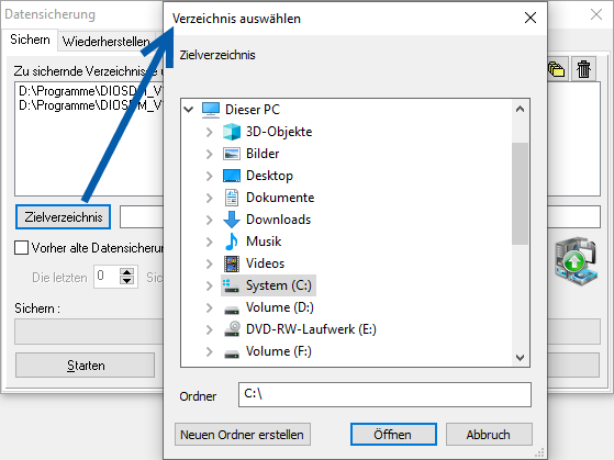 Über einen Mausklick auf den Button Zielverzeichnis wird der Speicherort für die Datensicherung ausgewählt.