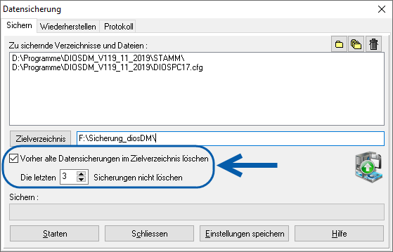 Wird eine neue Sicherung erstellt, hat man über die Aktivierung des Kontrollkästchens die Möglichkeit, vor Erstellung der neuen Datensicherung alte Sicherungen zu löschen. Stellen Sie, wenn gewünscht, hierunter die Anzahl der alten Sicherungen ein, die NICHT gelöscht werden sollen. Speichern Sie anschließend Ihre Einstellungen über den entsprechenden Button.