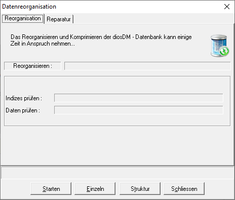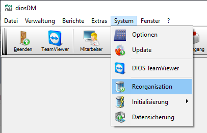 Per Datenreorganisation werden defekte Datenbestände korrigiert. Eine Reorganisation ist in erster Linie dann erforderlich, wenn während des Betriebs von diosDM Datenbankfehlermeldungen auftreten. Nach Rücksprache mit dem dios Support kann anschließend eine Reorganisation durchgeführt werden. Öffnen Sie das Fenster Reorganisation über den Menüpunkt System und den Auswahlpunkt Reorganisation.