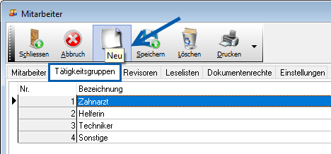 Im Register Tätigkeitsgruppen werden neue Gruppen über den Button Neu hinzugefügt.