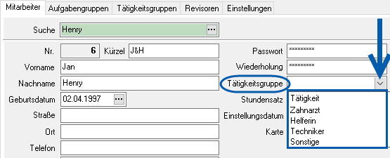 Alle gespeicherten Tätigkeitsgruppen werden in dem Feld Tätigkeitsgruppe als Drop-Down-Liste in dem Hauptregister Mitarbeiter dargestellt.